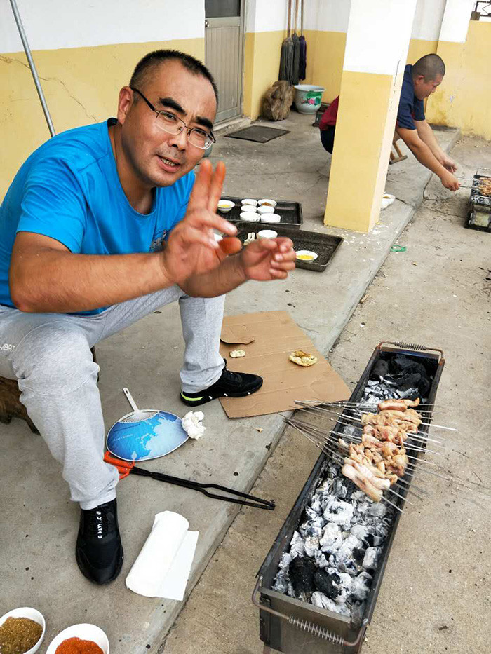 ↓這位老師傅,在等著徒弟烤好了孝敬自己,神情略微有些焦急和不滿:烤的真慢……一瓶水都見底了,還沒吃上肉!